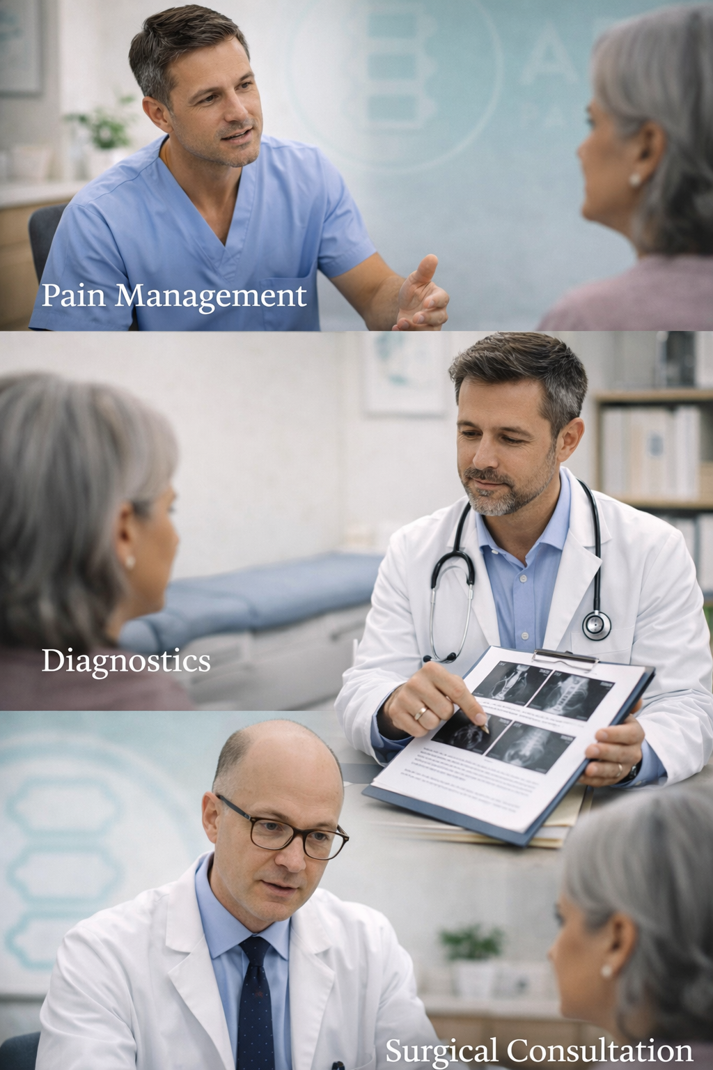 Pain management, diagnostics, and surgical consultation operate in sequence.